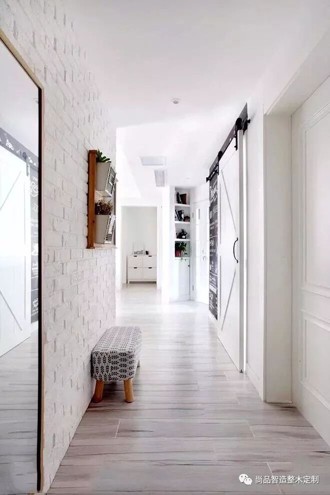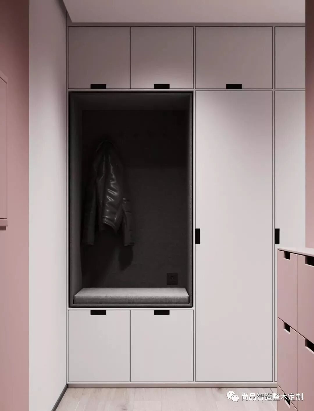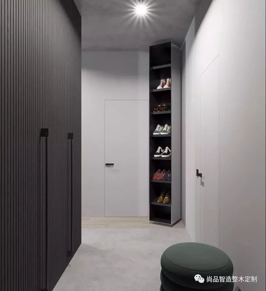 如果家里常住的人数不多的话,更建议只装隔板架,其它的比如板凳或挂钩就不要布置了,直接留白,这样既可以保持空间的通透,整个空间的视觉也会有扩充的效果。